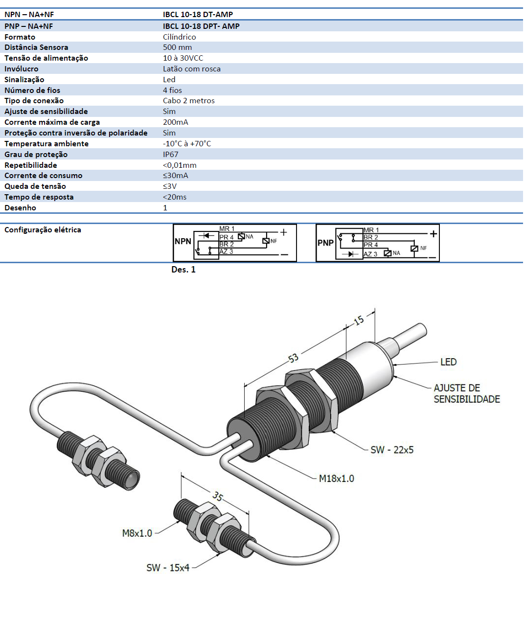 Fotoelétrico Barreira com Amplificador - Corrente Contínua: NPN – PNP – 4 fios