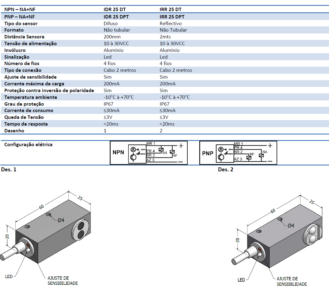 Fotoelétrico Difuso / Fotoelétrico Reflectivo Corrente Contínua: NPN – PNP – 4 fios
