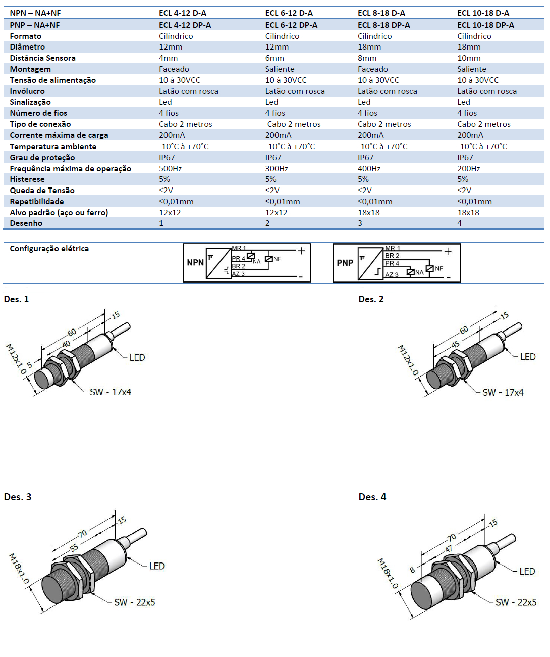 Corrente Contínua – NPN – PNP – 4 fios – Distância Aumentada M12x1 – M18x1