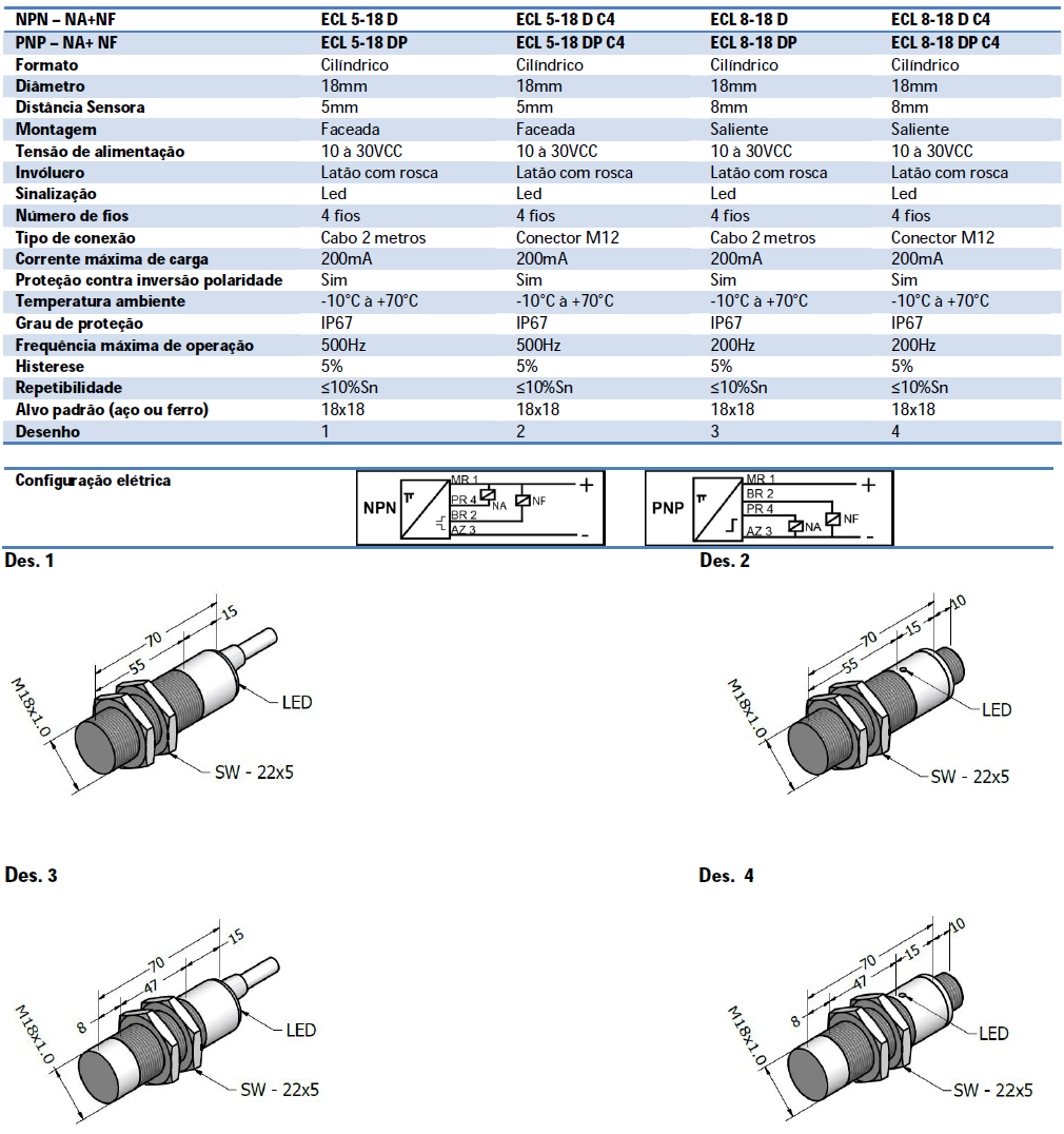 Corrente Contínua: NPN – PNP – 4 fios M18x1