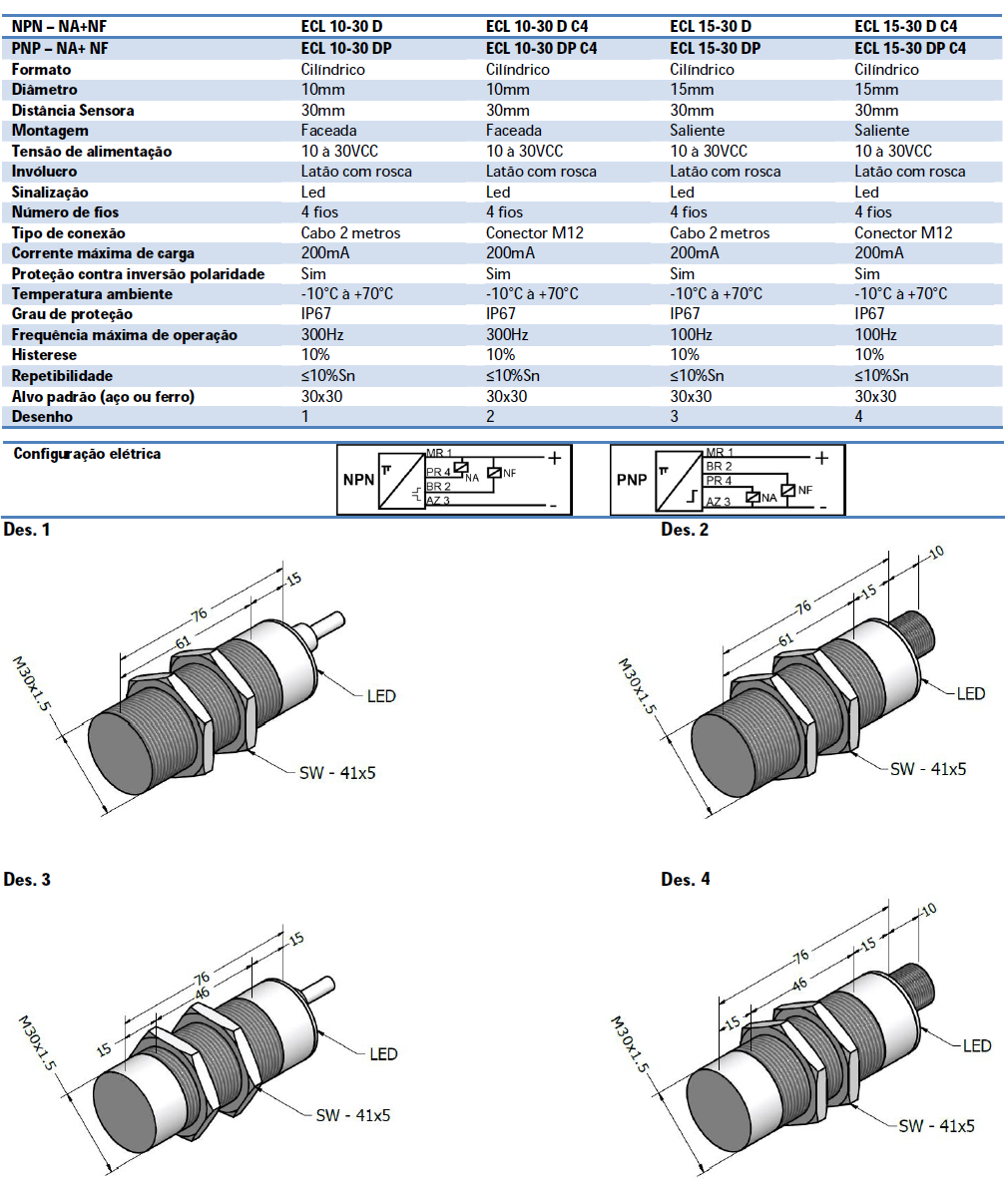 Corrente Contínua: NPN – PNP – 4 fios M30x1,5