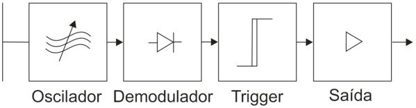 Sensores de proximidade indutivos são elementos ativos capazes de efetuar um chaveamento elétrico sem que seja preciso algum corpo metálico tocá-lo fisicamente. Conforme mostra o diagrama de blocos acima, um sensor tem como coração um oscilador de rádio frequência. Esta oscilação é modificada quando se introduz um objeto metálico no campo magnético da bobina, retornando ao normal quando se retira o objeto. As modificações do comportamento do oscilador são demoduladas e interpretadas pelo trigger de modo a obter-se uma saída de sinal HIGH-LOW, ou seja, uma onda quadrada bem definida, capaz de excitar um circuito de potência, tal como um transistor ou um tiristor, obtendo assim uma chave liga-desliga em estado sólido, com condições de efetuar um chaveamento sobre bobinas de relê, pequenos contatores, ou mesmo circuitos lógicos. Todo esse conjunto eletrônico é montado em forma bastante moderna utilizando técnicas avançadas, o qual é alojado em invólucros plásticos ou metálicos e encapsulado com resina epóxi de alta densidade, formando um bloco sólido à prova d’água, vibrações e intempéries.
