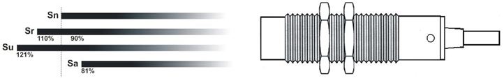 Esta distância é a que garante um funcionamento seguro do sensor, sob as condições estabelecidas de temperatura e tensão. Ela pode ser escolhida entre 0 e 81% de Sn.